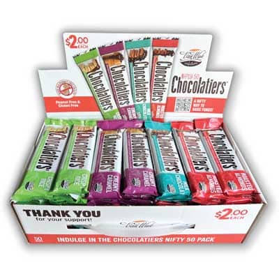 The Nifty 50 Chocolatiers Assorted Pack is a proven fundraiser favorite, offering a variety of popular chocolate flavors that appeal to everyone. With four classic options in every carrier, supporters can choose their favorite—or grab more than one.